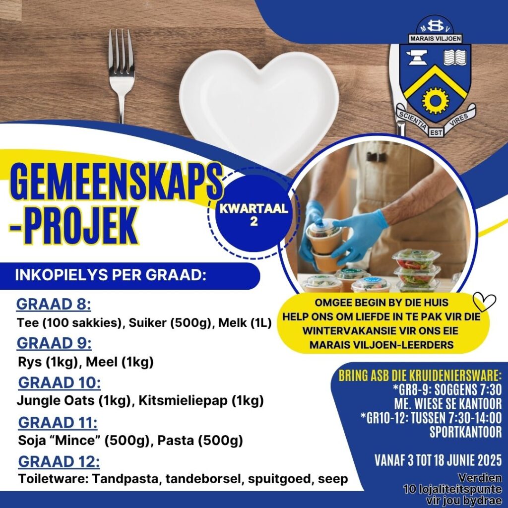 • Jaarlikse Carols by Candlelight Blikkie-insameling, waar ons as skool saamstaan om kos en noodvoorraad in te samel vir behoeftige gesinne